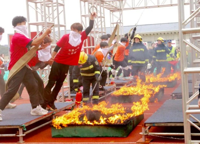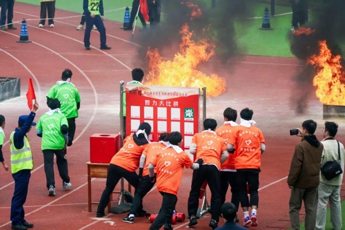 决赛现场模拟火场零距离、迷宫逃生、智力大比拼等10项逃生环节,选手们在比赛模拟过程中,熟练运用灭火器灭火、快速铺设水带、低姿匍匐逃生、结绳自救等技能,动作精准利落,展现出扎实的消防技能与出色的应急反应能力,现场掌声、欢呼声不断。
