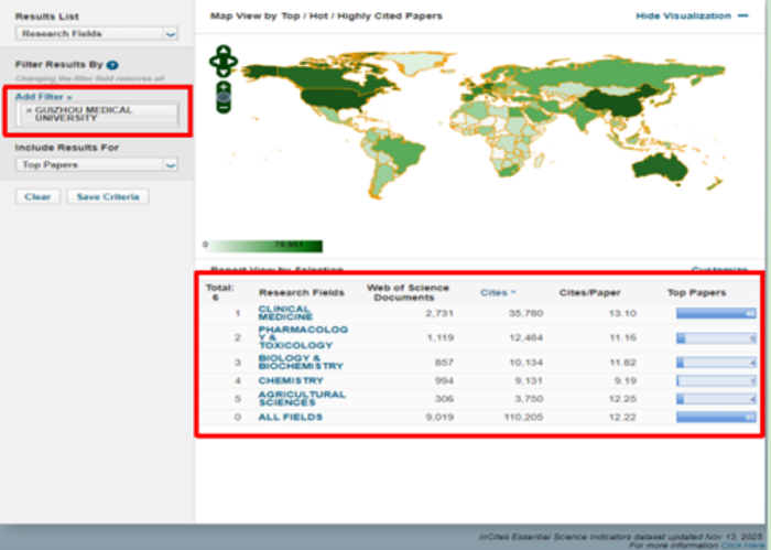 根据科睿唯安(Clarivate Analytics)基本科学指标数据库(Essential Science Indicator,ESI)2025年11月13日最新数据(数据覆盖时间范围为2015年1月1日-2025年6月30日)公布的ESI统计数据,贵州医科大学“农业科学(AGRICULTURAL SCIENCES)”学科首次进入ESI全球排名前1%,这是本年度继化学(CHEMISTRY)学科成功入围后,新增的第二个ESI全球前1%学科。
