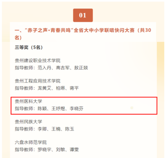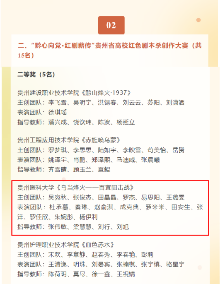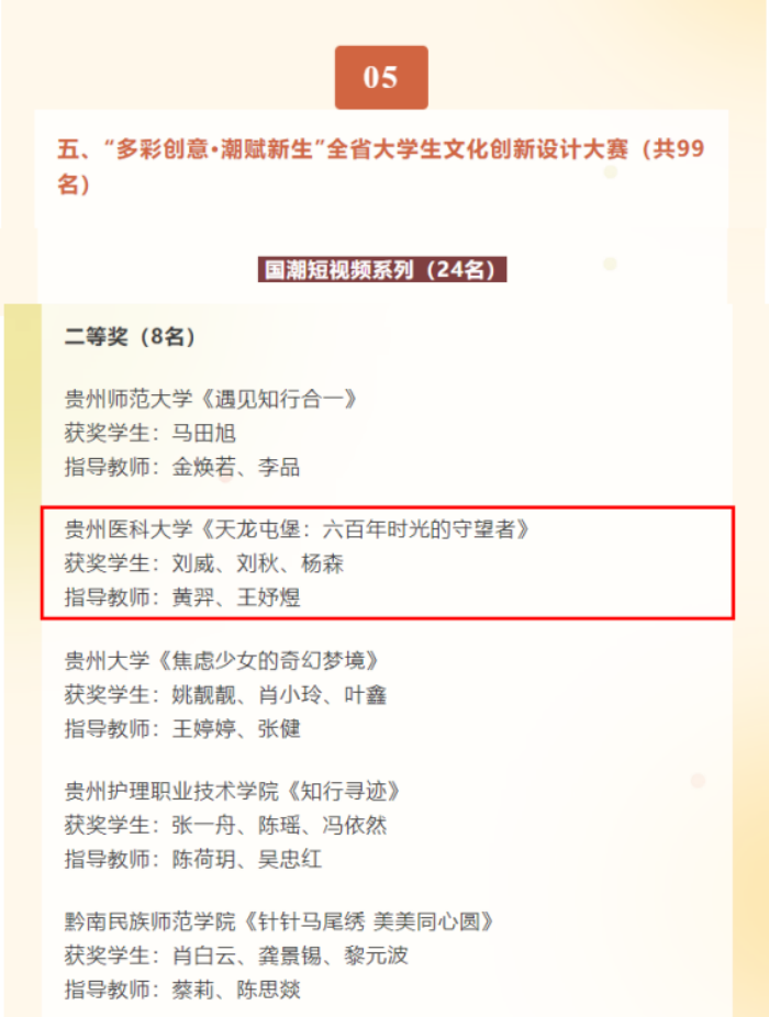 贵州医科大学师生在多项赛事中表现突出,共荣获省级奖项三项,分别是“赤子之声·青春共鸣”全省大中小学联唱快闪大赛三等奖、“黔心向党·红剧薪传”贵州省高校红色剧本杀创作大赛二等奖、“多彩创意·潮赋新生”全省大学生文化创新设计大赛国潮短视频系列二等奖。