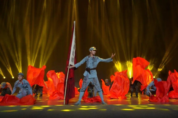 在颁奖仪式现场,贵州工程应用技术学院艺术学院创作的舞台剧《赤水乌蒙红飘带》(片段)作为一等奖作品受邀展演。伴随着激昂的音乐声,演员们身着具有时代特色的服装登场,生动再现了红军长征途经贵州的艰难岁月,重现了地下党员林青不惧艰险支援革命的感人故事;该剧目以精湛的表演艺术还原红色历史,融入地方民族元素,兼具思想深度与文化底蕴,细腻的情感表达与紧凑的剧情设计让现场掌声不断,将颁奖仪式的氛围推向高潮。这部作品不仅展现了学校艺术创作的高水平,更传递了深刻的精神内涵,赢得了在场嘉宾的一致好评。