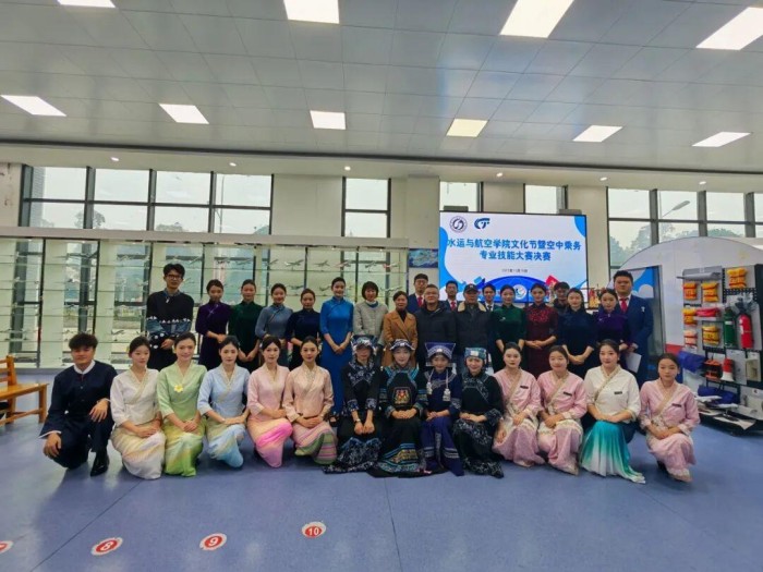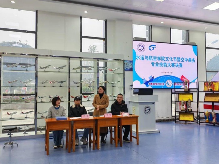 近日,水运与航空学院文化节暨空中乘务专业技能大赛决赛在航空实训基地成功举办。24级全体学生组成乘务小组参加初赛,经筛选,共有10支队伍进入决赛。学院学生科科长高彪、教务科科长彭爱泉出席并担任评委。
