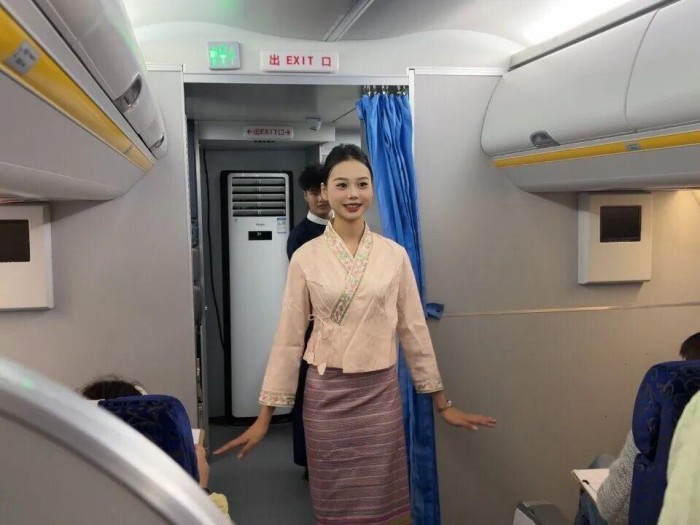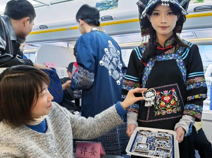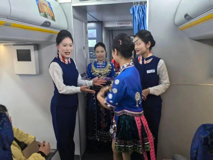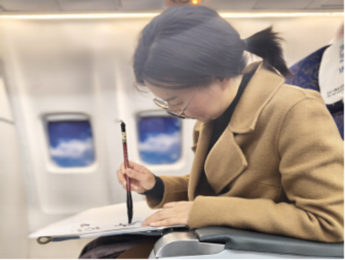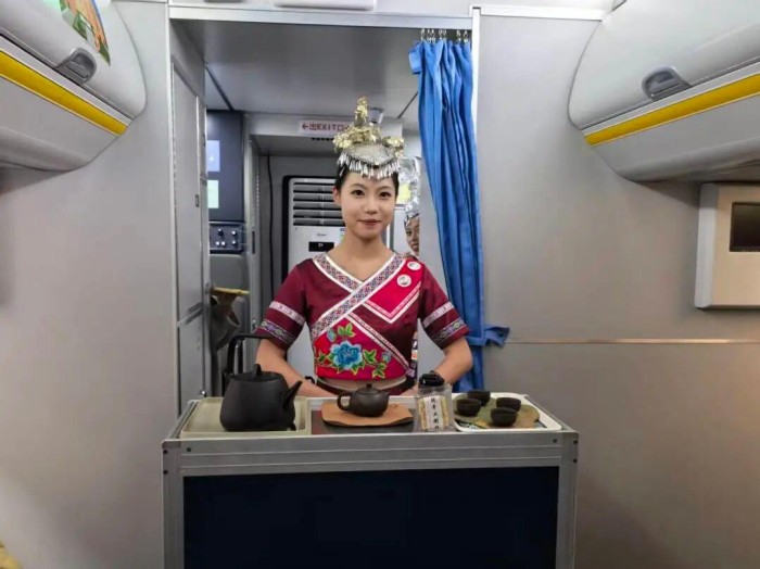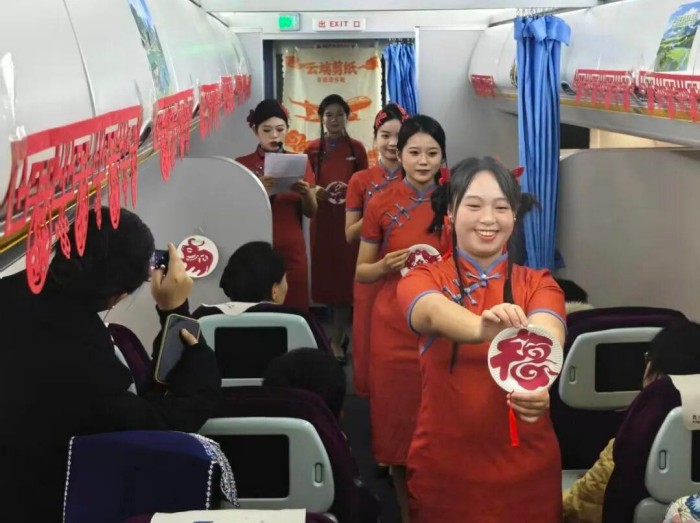 比赛中,参赛小组热情邀请评委老师和扮演旅客的同学们进行互动。客舱内,“旅客们”品尝清香四溢的缅桂花茶、提笔挥毫体验书法之趣、亲手制作扎染与剪纸,还品尝了多种富有民族风味的特色美食。乘务组与“旅客”们笑容洋溢,整个客舱都沉浸在热烈而欢快的氛围之中。