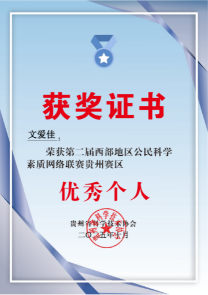 近日,第二届西部地区公民科学素质网络联赛贵州赛区的获奖名单正式揭晓。学校科学教育专业的五名学生凭借扎实的科学素养,在激烈的竞争中脱颖而出,荣获贵州赛区优秀个人称号。本次大赛由贵州省科学技术协会联合西部其他11个省(区、市)科学技术协会共同主办,于2025年5月30日正式开启答题通道。截至8月30日20:00,全省共有8108人参与答题,累计答题次数达135124次,最终评选出50名优秀个人。