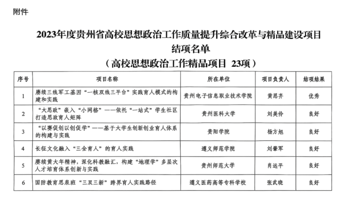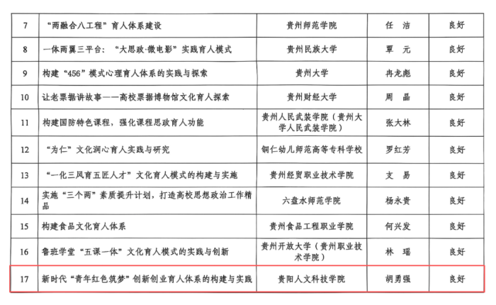 近日,贵州省教育厅正式印发《省教育厅关于公布2023年度贵州省高校思想政治工作质量提升综合改革与精品建设项目结项结果的通报》,贵阳人文科技学院创新创业学院院长胡勇强教授主持的《新时代‘青年红色筑梦’创新创业育人体系的构建与实践》项目,历经多轮严格评审与成果核验,顺利通过省级验收,获评“良好”等级结项,为学校思政教育与创新创业教育融合发展再添重要成果!
