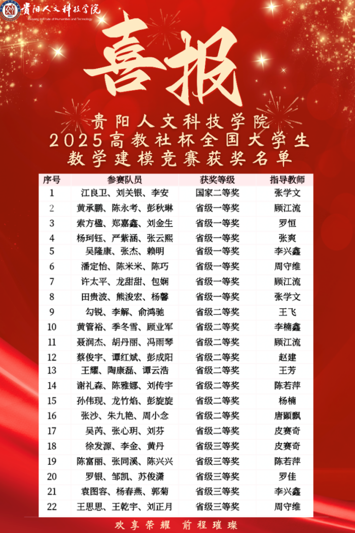 近日,2025年“高教社杯”全国大学生数学建模竞赛结果揭晓,贵阳人文科技学院学子在本次竞赛中喜获佳绩,荣获国家二等奖1项、省级一等奖7项、省级二等奖9项、省级三等奖5项,共计22项,获奖总数位居全省本科高校第三。