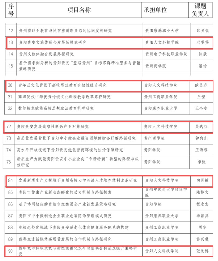 近日,贵阳市社会科学界联合会正式公布2025年度联合课题立项名单,贵阳人文科技学院共有5项课题成功获批,彰显了学校在服务地方社会科学研究领域的坚实实力与突出成效。