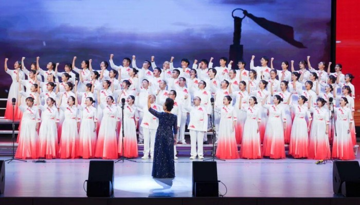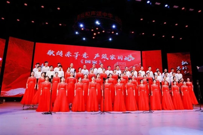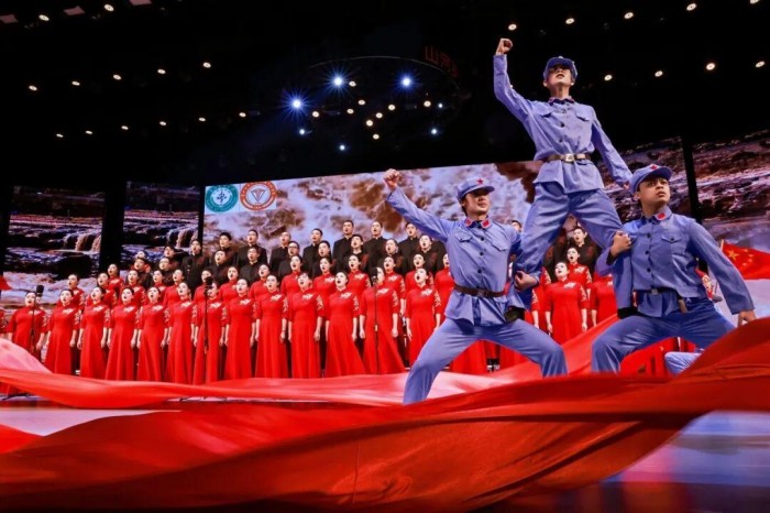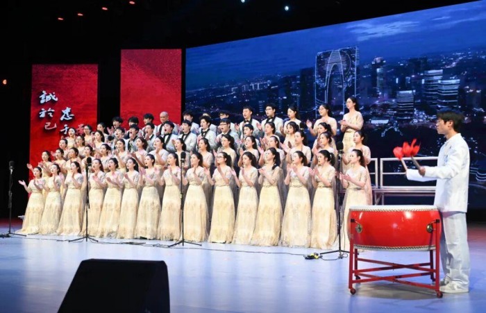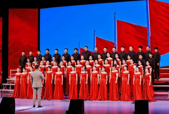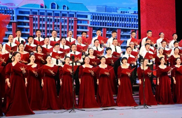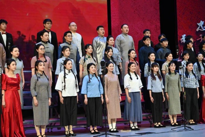 活动现场庄重大气,舞台背景以红色为主基调,金色纹饰勾勒出学校标志性建筑剪影,象征红色基因与育人使命的交融。各参赛队伍身着统一服装,精神饱满登台。