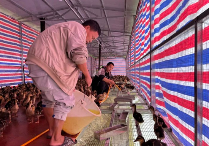 产业发展,技术为基。自浪寨村将麻鸭养殖确立为村集体经济主导产业以来,凯里学院紧扣当地资源禀赋,充分发挥学科专业优势,组织大健康学院专家教师组建帮扶团队,多次深入养殖基地开展“点对点”技术指导与专题培训。从棚舍通风采光优化、常见疫病防控,到饲料科学配比、养殖周期管理,老师们将专业知识转化为通俗易懂的实操技巧,手把手传授给养殖户,有效提升了麻鸭存活率和养殖效益,为打造优质生态麻鸭产品筑牢技术根基。