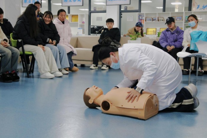 本次培训特邀校医务室张英医生主讲,内容紧密结合校园常见应急场景,涵盖心肺复苏术(CPR)、海姆立克急救法、外伤止血包扎、秋冬传染病防控及日常急救常识等核心模块。培训中,张英医生系统讲解急救理论知识,强调“时间就是生命”的急救核心理念,并结合实操演示,让同学们直观掌握急救技能要点。