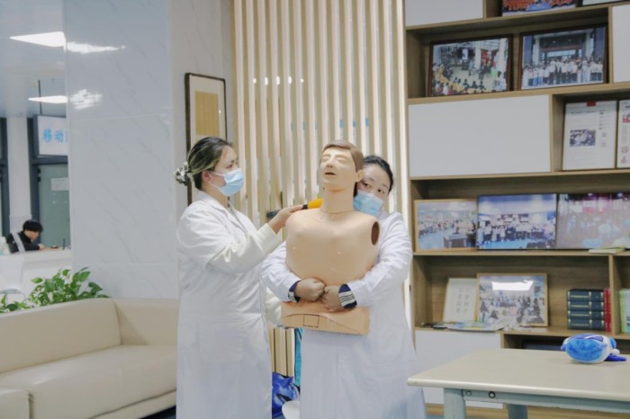 在心肺复苏术教学中,张英医生详细拆解操作流程,从现场环境安全评估、患者意识与呼吸判断,到胸外按压的位置、深度、频率等标准,再到开放气道与人工呼吸的规范配合,逐一进行细致指导。同时,同学们分组在模拟人上进行实操练习,张英医生逐一纠正动作偏差,确保大家掌握正确操作方法。