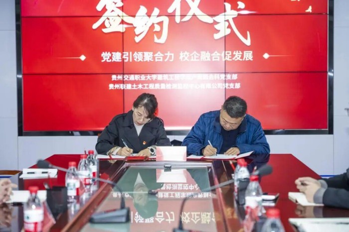 为深入贯彻落实新时代党的建设总要求,以党建领航深化道路与桥梁工程专业群建设,构筑“红色高桥”党建品牌新范式,12月11日,贵州交通职业大学建筑工程学院产教融合科党支部与贵州联建土木工程质量检测监控中心有限公司党支部联合开展“党建引领聚合力,校企融合促新篇”联建共建活动。