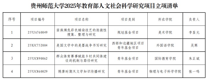 近日,教育部社科司公布了2025年度教育部人文社会科学研究一般项目立项名单,贵州师范大学获批4项(规划基金项目1项、青年基金项目2项、西部和边疆地区项目1项),立项数位列贵州省第一,涉及体育科学、新闻学与传播学、艺术学、外国文学等多个学科领域。