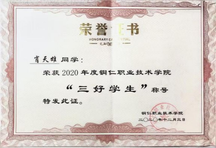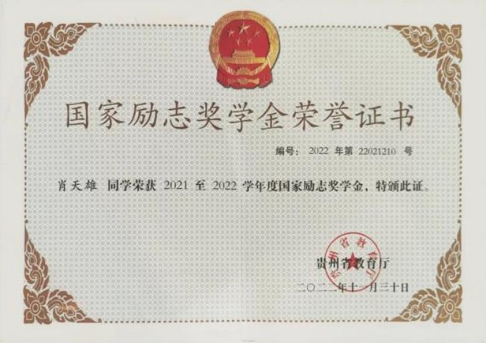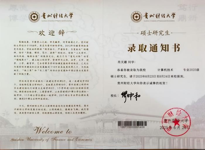 做一名优秀的高职生并不是他的终点,肖天雄早已为自己专升本制定了严密的复习计划,每天清晨六点起床背诵,课后直奔图书馆,晚上闭馆后还要在宿舍自习室学习到凌晨。这样的坚持有了回报,2021年他顺利考入贵州师范大学深造学习,荣获国家励志奖学金、校级优秀学生;2023年进入贵州黔狐科技有限责任公司工作,随后被铜仁职业技术学院聘为外聘兼职教师。当同学们以为他会松口气时,他已经在准备研究生考试了。“我想证明,职校生同样有无限可能。”他以持之以恒的韧劲,交出了一份满意答卷,2025年被贵州财经大学录取为计算机专业研究生,开启了新的求学生涯。