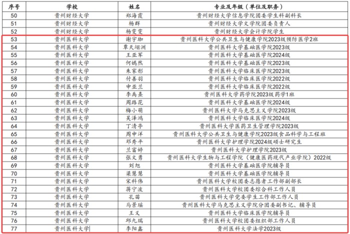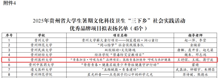 6月至10月,省委宣传部、省精神文明办、省教育厅、团省委、省学联共同举办了2025年贵州省大学生暑期文化科技卫生“三下乡”社会实践活动。近期,贵州医科大学获得全国“青春长征”专项优秀实践团队13项,获省级优秀实践单位8项、优秀实践团队41项、优秀实践个人25项、优秀品牌项目1项,共计88项,获奖数量创历史新高,位列全省第一。