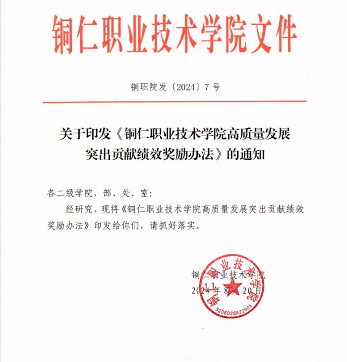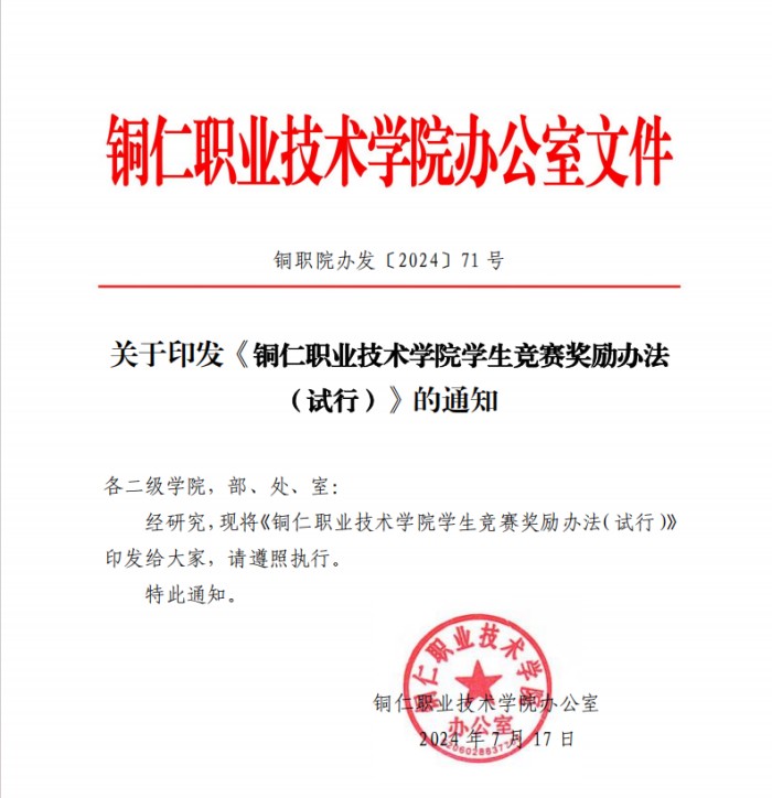 为充分调动青年学生参加科技创新竞赛的积极性和主动性,不断提升参赛项目质量,提高竞赛成绩,学校相继出台《铜仁职业技术学院高质量发展突出贡献绩效奖励办法》《铜仁职业技术学院学生竞赛奖励办法(试行)》等文件,对学生参加科创竞赛获奖在评优评奖、课程免试等方面给予鼓励支持;对老师指导学生参加科创竞赛活动在工作量认定、职称评定等方面给予激励。激励保障制度的推行极大地调动了学生与指导老师的积极性,扩大了学生科技创新实践工作的参与面。