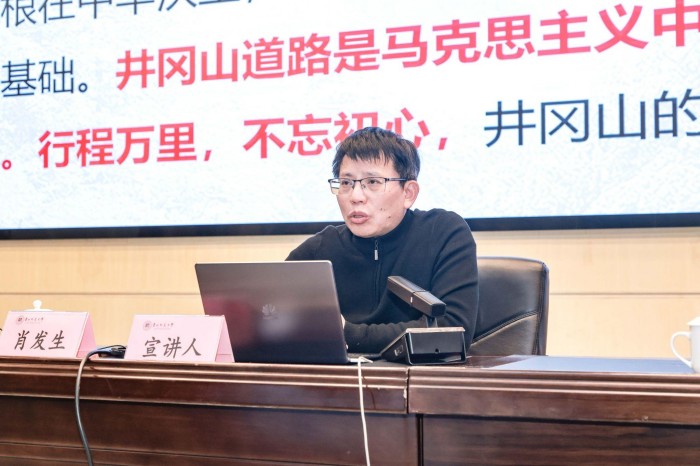 全国高校“中国共产党人精神谱系”宣讲团成员的井冈山大学井冈山研究中心主任肖发生,以《弘扬井冈山精神 传承红色基因》为题,深入阐释“坚定执着追理想、实事求是闯新路、艰苦奋斗攻难关、依靠群众求胜利”的精神要义。他回溯了井冈山作为中国革命摇篮的峥嵘岁月,讲述了大革命失败后,党在绝境中坚守信仰、开创“农村包围城市、武装夺取政权”道路的奋斗史诗,阐明理想信念是共产党人的“精神之钙”,号召新时代学子赓续红色血脉,让实事求是、艰苦奋斗的优良作风薪火相传。
