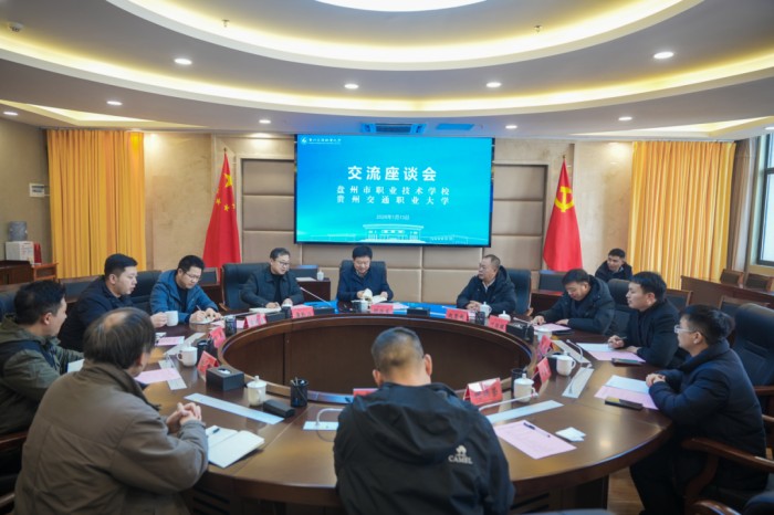 1月13日,盘州市职业技术学校党委书记赵贤雍一行到访贵州交通职业大学,围绕职教发展建设、未来产业布局、人才培养模式等议题开展交流座谈。校党委书记何兴发出席座谈会。会议由校党委常委、副校长詹黔江主持。