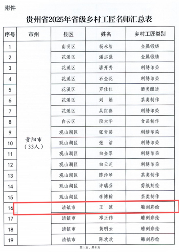 近日,贵州省农业农村厅、省教育厅、省工业和信息化厅、省人力资源和社会保障厅、省住房和城乡建设厅、省文化和旅游厅、省妇女联合会联合发布《贵州省2025年省级乡村工匠名师名单》,贵州交通职业大学教师王波荣获雕刻彩绘类省级乡村工匠名师。