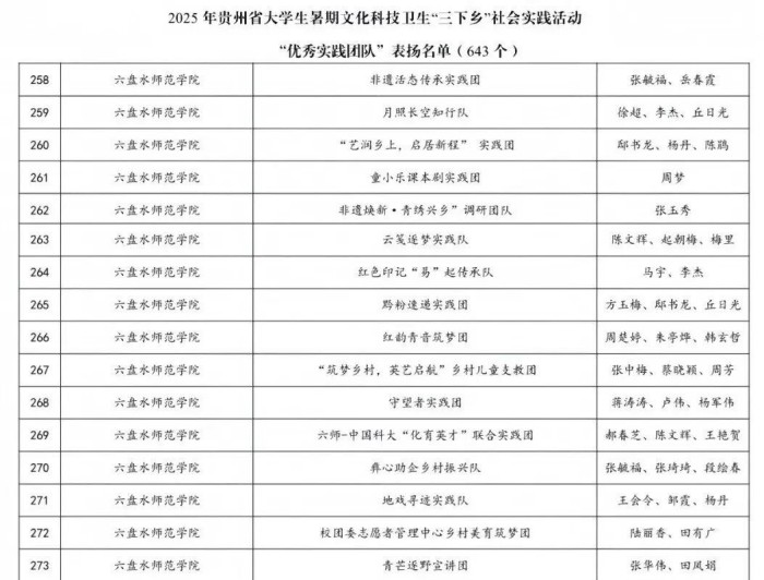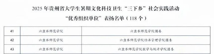 近日,2025年贵州省大学生暑期文化科技卫生“三下乡”社会实践评审结果公布。六盘水师范学院表现突出,共获30项荣誉,包括:3个单位获评“优秀组织单位”、10名师生获评“优秀实践个人”、16个团队获评“优秀实践团队”、1个项目获评“优秀品牌项目”。