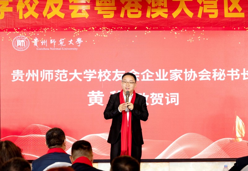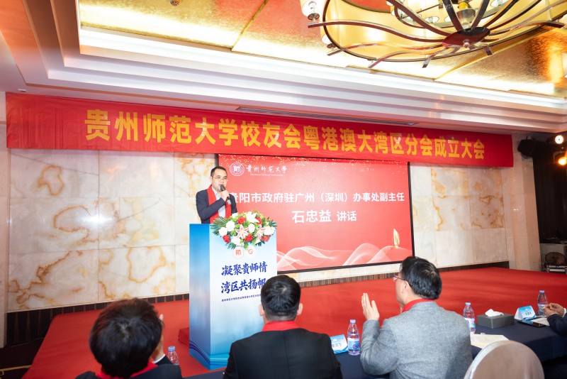 石忠益代表贵阳市政府驻广州(深圳)办事处,向贵州师范大学校友会粤港澳大湾区分会的成立致以诚挚祝福。他指出,八十余载办学历程中,贵州师范大学培育出四十余万优秀校友,在各领域、各行业、各战线,以卓越实绩彰显贵师大风采。他相信,分会必将成为贵师大校友情谊共叙、合力凝聚的温馨家园,粤黔协作才智汇聚、良策献智的高端智库,贵阳贵安资源互通、合作共赢的广阔平台。他衷心期许,贵阳市政府驻广州(深圳)办事处能够成为分会最可靠的“发展合伙人”,推动双方务实合作走深走实、行稳致远。