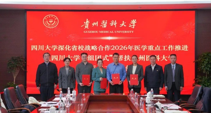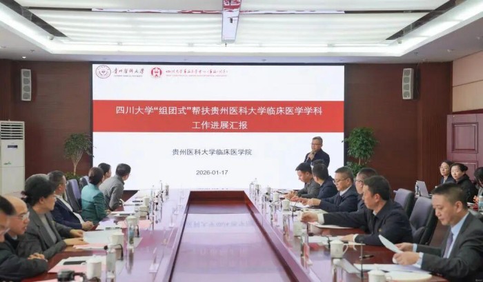 1月17日,四川大学帮扶贵州医科大学临床医学学科工作总结暨2026年度帮扶重点工作座谈会在北京路校区行政楼6楼连廊会议室举行。四川大学党委常委、副校长叶玲,学校党委书记汤磊,校党委副书记、校长俞松,校党委常委、副校长曾柱,附属医院院长左石出席,副校长潘卫东主持。华西医学中心、华西临床医学院(华西医院)、华西第二医院、华西口腔医学院(华西口腔医院)及相关处室负责人,学校、附属医院相关职能部门及临床医学院、口腔医学院负责人参加。