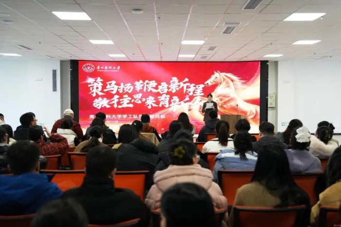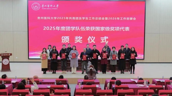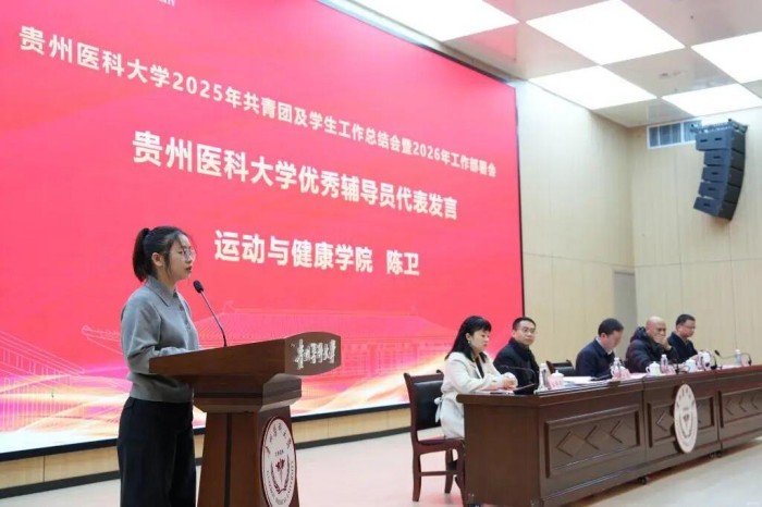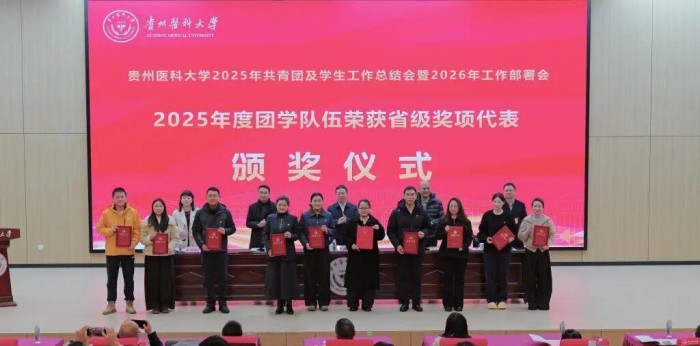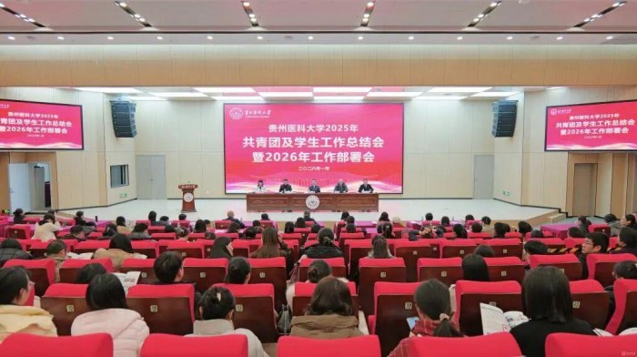 1月12日,贵州医科大学2025年度共青团及学生工作总结会暨2026年工作部署会在云漫湖校区道德讲堂召开。会议全面总结回顾过去一年工作,系统部署新一年重点任务,并开展了学工队伍交流分享、“一站式”学生社区巡游参观及特色项目团建活动。校党委书记汤磊,校党委副书记于浩出席会议并讲话。党政办公室、党委学生工作部(学生处、武装部)、党委研究生工作部、校团委、招生就业处、大学生心理健康教育与咨询中心等部门负责人及工作人员,各学院党委书记、分管学生工作副书记、学生科科长、院团委负责人及全体辅导员参加。