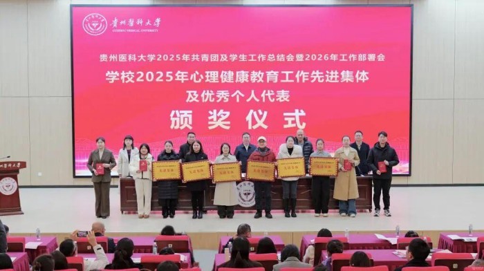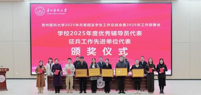 党政办公室主任杨毅宣读了《贵州医科大学2025年度辅导员考核评优结果》《贵州医科大学关于表彰2025年度征兵工作先进单位的决定》《贵州医科大学关于表彰2025年心理健康教育工作先进集体及优秀个人的决定》等表彰文件。