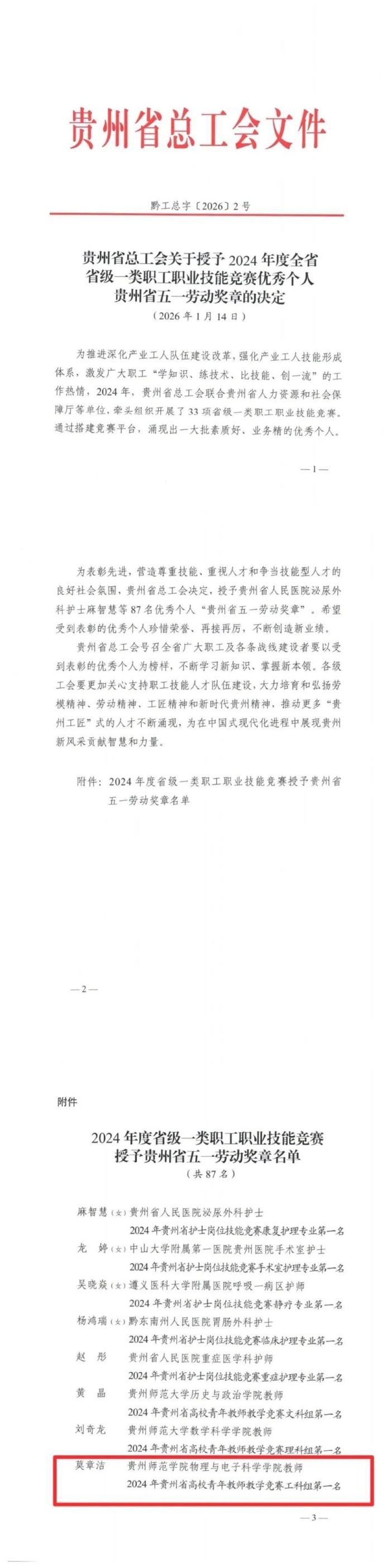 根据贵州省总工会2026年1月14日下发的《关于对2024年度劳动和技能竞赛先进集体和优秀个人授予五一劳动奖和工人先锋号的决定》,贵州师范学院莫章洁老师喜获“贵州省五一劳动奖章”荣誉称号。