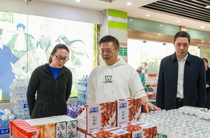 在校内超市,校领导详细查看货品上架情况和生产保质日期,要求超市负责人严把食品安全关,让同学们买得放心、用得安心。