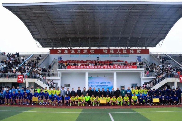 3月27日,2025-2026赛季黔东南州“州长杯”青少年校园足球超级联赛高校组闭幕式在凯里学院举行。州委副书记、州长杨光杰出席闭幕式并颁奖。凯里学院党委书记倪毅、校长龙健,副州长杨承进参加。
