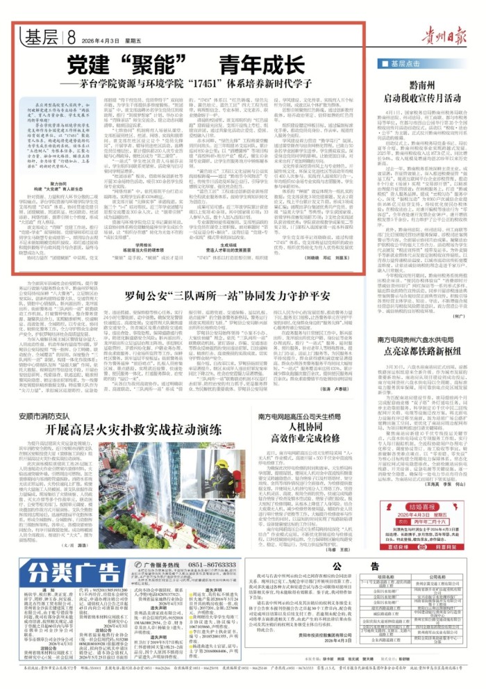 赤水河畔,“绿色先锋”工程将课堂搬到田间地头。近三年组建16支巡河队,累计巡河850余公里;以“酒糟菌棒”等项目构建“高校科研+地方产业”模式,催生10余项专业调研,让学生在服务地方中锤炼硬本领。
