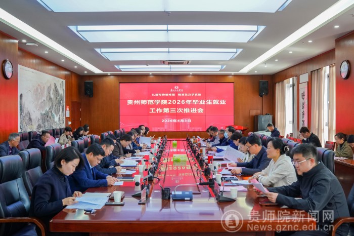 为深入学习贯彻习近平总书记关于做好高校毕业生就业工作的重要指示批示精神,全面贯彻党中央、国务院和省委、省政府决策部署,认真落实全国、全省高校毕业生等青年就业创业工作视频会议精神,4月3日上午,贵州师范学院在信息楼二楼会议室召开2026年毕业生就业工作第三次推进会。全体校领导出席会议,相关职能部门主要负责人、各学院党政主要负责人及招就处全体工作人员参加会议。会议由校党委常委、副校长(正厅长级)赵守盈主持。