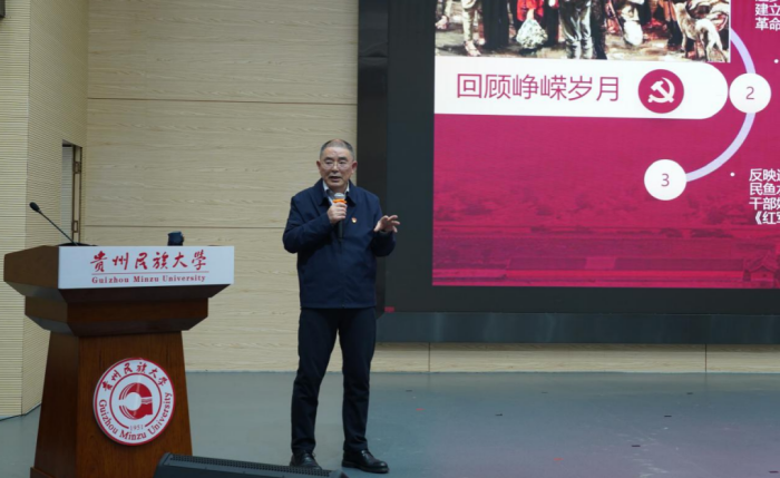 歌声激荡百年征程,旋律赓续红色血脉。近日,贵州民族大学“贵山石榴红·籽籽丹心讲堂”在南校区图书馆一楼报告厅开讲。贵州民族大学原党委副书记唐建荣教授、青年歌手王韦韦及团队成员乔洪波老师共同奉献了一堂精彩的“百年党史 一路红歌”音乐思政课。贵州民族大学党委副书记杨楠,贵州民族大学党委常委、副校长董强出席,贵州民族大学马克思主义学院和贵阳信息科技学院约200名师生齐聚现场,在红色旋律中回望党的百年奋斗历程,共汲奋进力量。