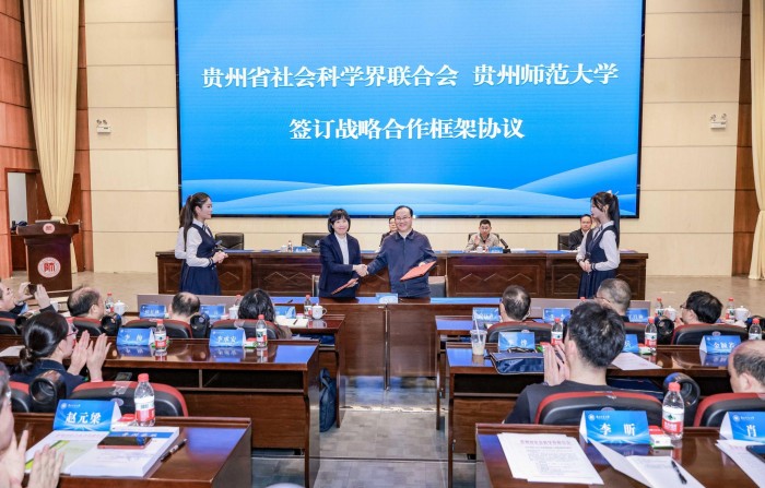 4月20日下午,2026年《贵州咨政》工作推进会在贵州师范大学东区会议中心一楼学术报告厅召开。省社科联党组书记、副主席范省伟讲话,贵州师范大学校长张绍东致辞。省社科联党组成员、副主席黄昌祥与贵州师范大学副校长刘瑾分别代表两家单位签订战略合作框架协议。省社科联党组成员、秘书长丁凤鸣主持会议。贵州工程应用技术学院党委书记熊星、贵阳康养职业大学党委书记冉江舟等高校领导出席会议。
