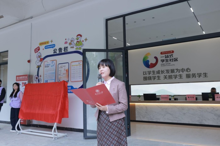 刘瑾在致辞中指出,“一站式”学生社区协同育人中心的正式启用,标志着贵州师范大学学生社区建设迈入了新阶段。她强调,育人中心的建设是学校贯彻落实党的教育方针、深化“三全育人”综合改革的重要举措,将有效推动思想引领、学业发展、生活服务、心理健康等工作向学生生活区延伸,打破传统育人场域的时空限制,构建起围绕学生、关照学生、服务学生的育人新阵地,让育人工作更有温度、更有深度、更有实效。她表示,学生是社区的主人翁,应该更加主动地参与到社区的各项活动中,积极建言献策,充分发挥自我教育、自我管理、自我服务的作用;各部门和学院要以育人中心启用为契机,进一步整合资源、协同联动,将育人力量下沉到学生一线,共同把学生社区建设成为一个充满活力、友爱互助、积极向上的温馨家园,让每一位学生都能在这里收获知识、友谊与成长。