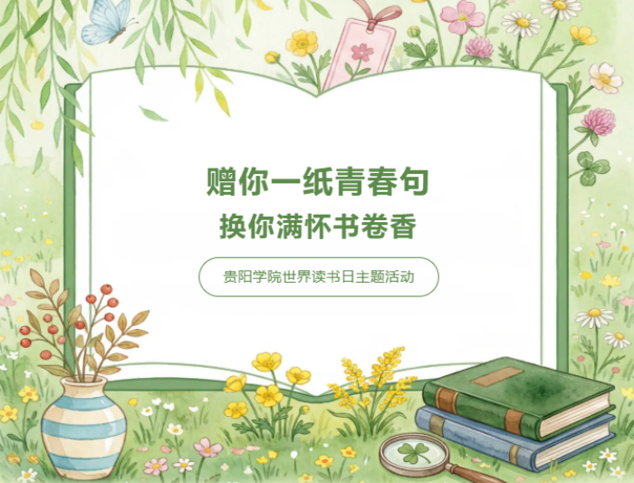 为迎接第31个“4·23”世界读书日,营造浓厚书香校园氛围,贵阳学院近日举办了“赠你一纸青春句,换你满怀书卷香”主题系列活动。活动分为线上征集与线下互动两大板块。线上“光影心语”板块面向全校征集校园美照与励志语录,优秀作品将进行线上展示及投票评选,获奖者可获得校级文创礼品。线下活动于4月23日12:00至20:00在阳明广场举行,面向全体在校学生,开展打卡定格拍照、抖音互动留言、线上获奖文创礼品领取等丰富环节。其中,“文脉快答”专场于当日18:00开启,围绕诗词名句、经典名言及阳明文化语录进行现场抢答,参与者可赢取定制校园明信片等纪念品。