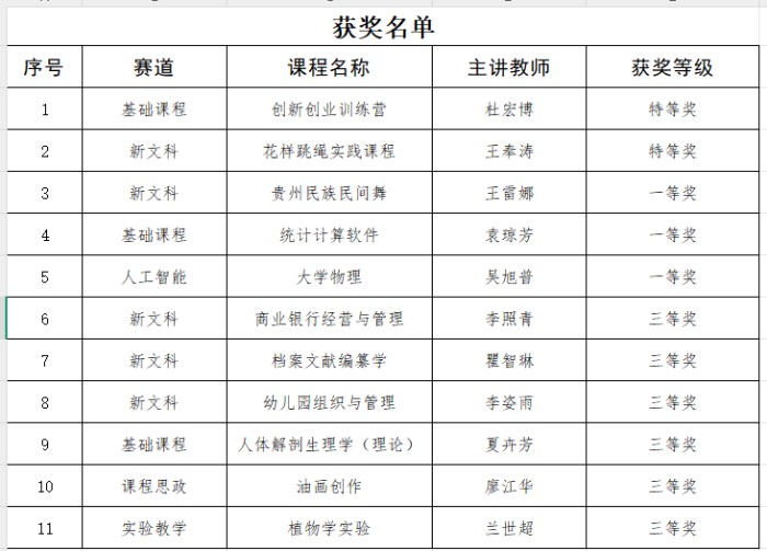 本届大赛以“推动教学创新 培养一流人才”为主题,通过网络评审(课堂教学实录视频、创新成果报告)与现场评审(教学设计创新汇报及提问交流)两个阶段综合考评。贵州师范学院获奖课程涵盖新文科、人工智能、基础课程等多个赛道,其中,特等奖项目聚焦赋能地方师范生创新能力与素养提升,通过2库2场景的创新体系构建、线上+线下+AI多模态课堂与智能化评价实现教学内容与方法的突破;以AI赋能花样跳绳教学为亮点,凸显体育师范创新人才培养特色。这些成果不仅彰显了课程团队将立德树人根本任务融入教学全过程的扎实实践,也体现了在推进教学模式改革、深化师范生人才培养与信息技术赋能教育教学等方面的系统性成效。