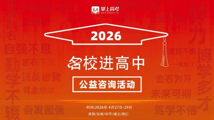 随着新高考改革持续深化,为促进省内外高校与贵州考生精准对接,助力高三学子科学备考、合理择校,由掌上高考与各市(州)高中联合举办的2026年“考前名校进高中”咨询活动于4月27日至29日在贵州省成功举办。