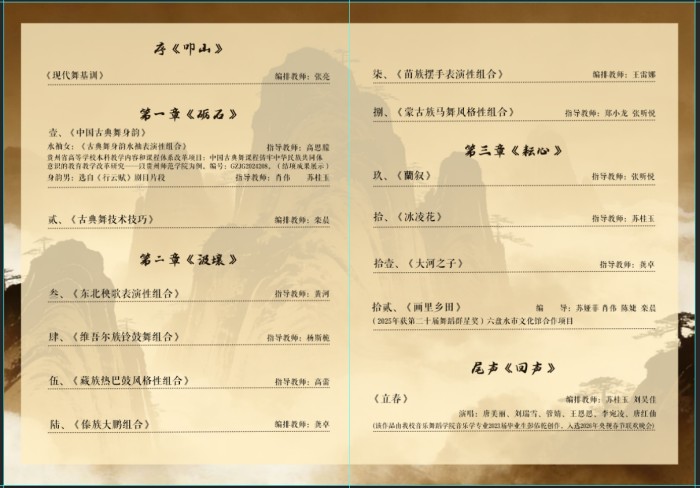 第三篇章《耘心》聚焦剧目创作与艺术表达,集中展示学子们在剧目学习、编排与演绎中的成长与突破。《蘭叙》在张昕悦老师指导下,以细腻的肢体传递深沉情感;《冰凌花》经苏桂玉老师点拨,用舞姿勾勒出生命的坚韧与柔美;《大河之子》在龚卓老师的指导下,以磅礴气势诠释对生命与土地的敬畏;由苏娅菲、肖伟、陈婕、栾晨四位老师共同编导的《画里乡田》,作为第二十届舞蹈群星奖获奖作品及六盘水市文化馆合作项目,更是以灵动舞姿勾勒出乡村田园的诗意画卷,传递出对乡土文化的深厚情怀。