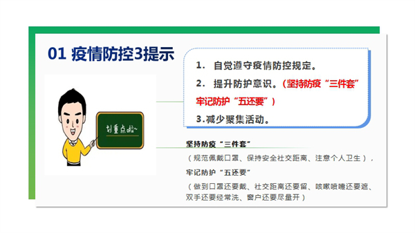提醒学生无论何时何地都要自觉遵守疫情防控规定,提高自我防护的意识,谨记防疫“三件套”,牢记防护的“五还要”。
