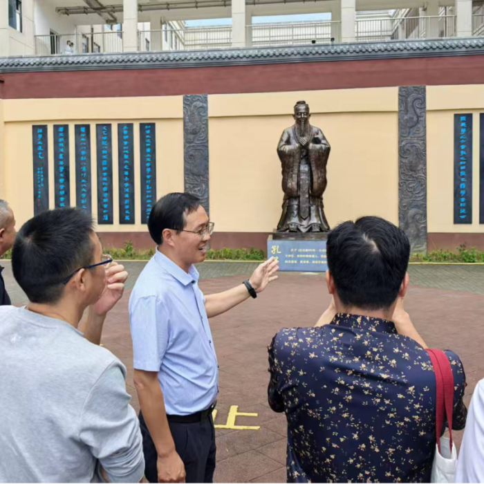 在贵州师大贵安新区附属初级中学领导的陪同下,罗甸县中小学道德与法治骨干国培班教师团队深入校园,开展实地参观考察。从活力盎然的操场到书声盈耳的教学楼,教师们全面了解了校园环境规划理念与现代化教学设施配置情况。在校园孔子像前驻足瞻仰,感悟中华优秀传统教育思想的传承脉络;在“思齐园”中漫步参观,体会校园文化景观的隐性育人功能,切实感受贵州师大贵安新区附属初级中学将文化底蕴与环境建设深度融合的鲜明特色。