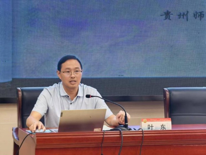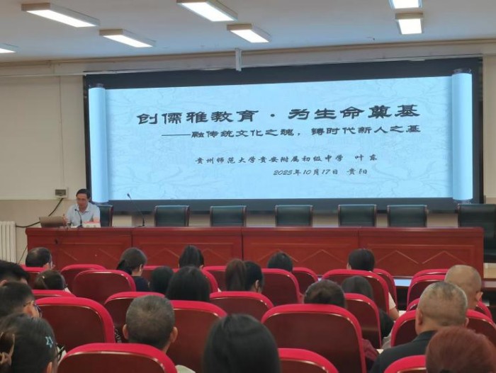 参观结束后,国培班教师团队在贵州师大贵安新区附属初级中学一号学术报告厅参加专题讲座交流活动。贵州师大贵安新区附属初级中学叶东校长以“创儒雅教育,为生命奠基——融传统文化之魂,铸时代新人之基”为题作专题讲座。讲座聚焦“传统文化与道德法治教育的融合路径”核心议题,叶东校长以贵州师大贵安新区附属初级中学“一训三风”为切入点,结合具体教育教学案例,深入剖析经典传统元素与校园文化的有机融合策略。活动通过案例分享、互动研讨等形式,组织与会教师交流教学经验、探讨实践困惑,现场氛围热烈且专注,取得了良好的交流效果。