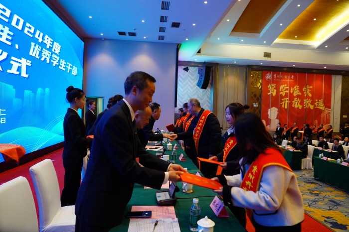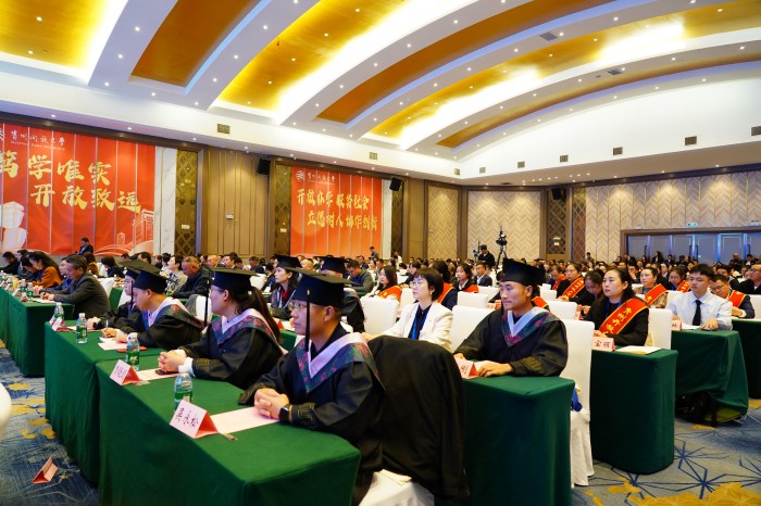 开学典礼上,各市州开放大学领导与新生家属代表通过视频为新生送来云端祝福。师长的殷殷期盼与家人的脉脉温情,共同汇聚成开学季最动人的乐章。在庄重的仪式环节,与会领导为2025年秋季新生代表佩戴了校徽,象征着开放大学精神的传承与接续。随后,大会表彰了2024年度优秀学员、优秀学生干部和优秀毕业生,并举行学士学位授予仪式。贵州开放大学党委副书记、校长罗勇为获得学士学位的毕业生代表拨穗正冠、颁发学士学位证书,将典礼推向高潮。