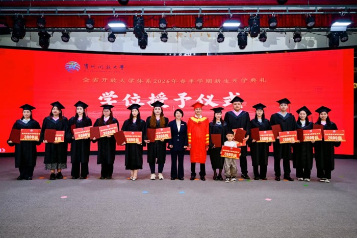 本次开学典礼还以数字赋能为新体验,将传统文化与开放教育深度融合,直观展示了开放大学“学分银行”、终身教育资源、社区教育和老年教育学习成果。接下来,全省开放大学体系将坚守立德树人根本任务,深耕终身教育主责主业,持续提升办学质量、不断拓展服务内涵,为构建泛在可及的终身教育体系和学习型社会建设、助力贵州省高质量发展注入更加强劲的“开大力量”。