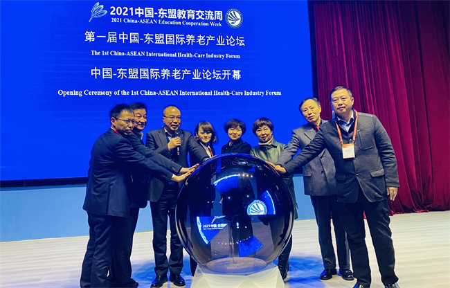 随后,中国-东盟教育交流周秘书处、贵阳市人民政府、白云区委区政府、贵阳市教育局、贵阳市民政局、贵阳幼儿师范高等专科学校、贵阳市养老服务行业协会共同开启象征着圆满、合作、包容和共赢的水晶球,宣布第一届"中国-东盟国际养老产业论坛"在贵阳开幕。