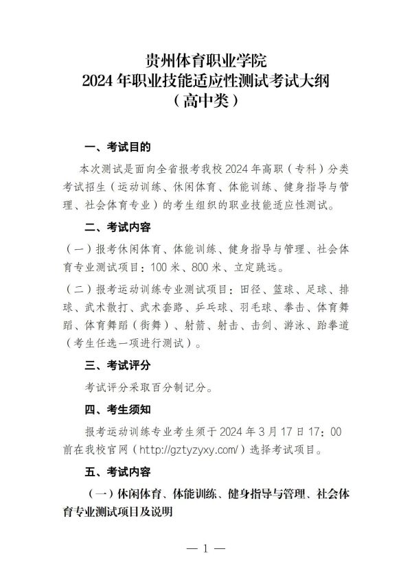 贵州体育职业学院2024年职业技能测试考试大纲(高中类)