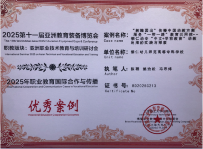 铜仁幼儿师范高等专科学校选送的《“教随园出”传播中国幼教方案 服务“一带一路”教育共同体——铜仁幼专“中文+学前教育”幼教出海的实践探索与实践》作为贵州高职院校6个案例之一,填补了幼教出海项目的空白。案例同步荣获博鳌职业教育发展大会优秀案例。