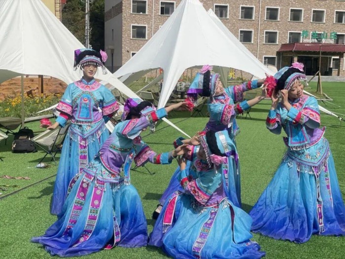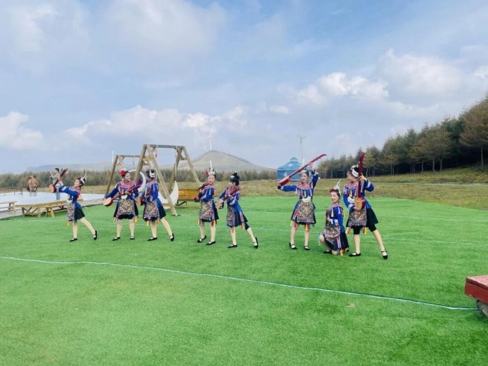 本次演出节目均来自“贵州民族民间舞蹈”课程成果,学生通过田野采风、非遗传承人指导等方式,对动作编排、服饰道具、文化内涵进行了深度挖掘。将《锦鸡舞》《糠包舞》《侗族大歌》等非遗特色节目带上实景舞台。苗族银饰声与侗族歌声在太行山谷中回响,赢得了现场游客的阵阵掌声。