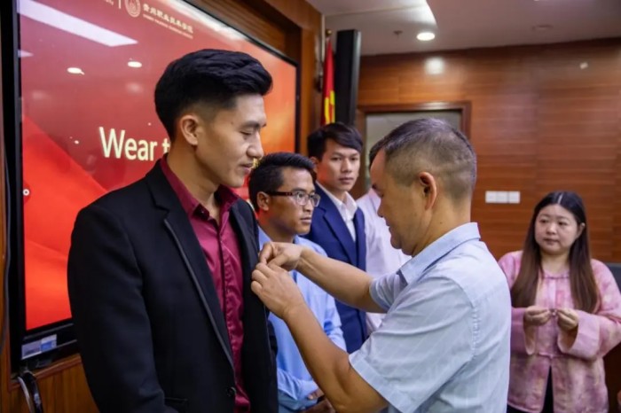 最后,林长松为五位学员逐一佩戴校徽,并宣布项目班正式开班。此次项目的顺利启动,标志着贵州职业技术学院在推进“中文+职业技能”国际化人才培养、深化中老教育合作方面迈出坚实一步,为构建中老命运共同体注入贵州教育力量。