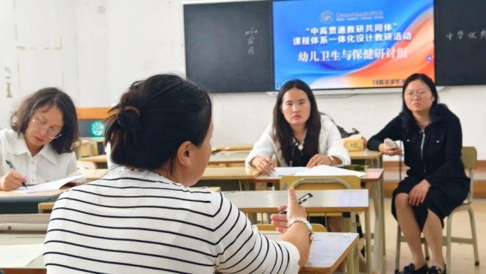 本次教研活动紧紧围绕课程体系一体化设计这一核心主题,就中高职贯通课程衔接、教学资源整合、课程标准制定等关键议题展开了深入研讨。活动过程中,双方教师积极互动,热烈交流教学经验,氛围浓厚。教研员们被分为6个小组,针对英语、习近平新时代中国特色社会主义思想概论、幼儿发展心理基础等8门重点课程进行了研讨。研讨始终坚持立德树人与产出导向,严格遵循一体化设计原则,力求避免中职与高职阶段课程内容的简单重复叠加,同时高度强调实践性,确保实践课时占比合理,以切实强化学生的技能培养。